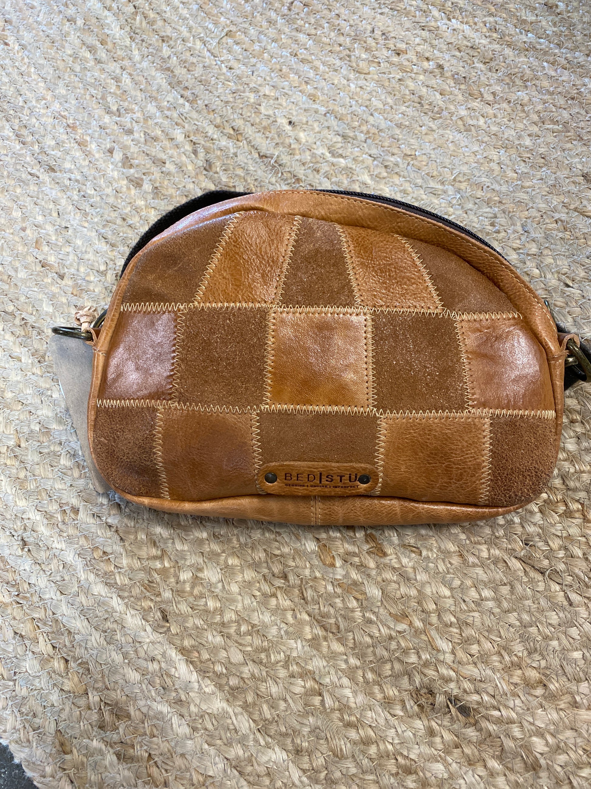 Unique scrap leather patchwork front, promising no waste at the factory level